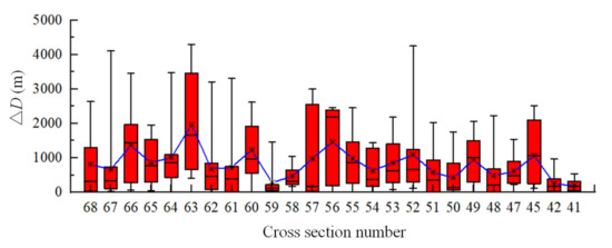 The section-scale thalweg migration distance was determined based on the repeatedly surveyed profiles of sedimentation sections in the Xiaobeiganliu reach in 1986–2001. Figure 6 shows the average, maximum, and minimum annual thalweg migration distances at 25 sedimentation sections along the Xiaobeiganliu reach. The section of CS63 had a maximum average thalweg migration distance of 1950 m, with a maximum annual migration distance of 4290 m in 1998. The average thalweg migration distances at the sections of CS59, CS58, CS42, and CS41 were relatively small, with magnitudes less than 500 m. This is because there were several natural nodes and river training works that can control the river regime at these sections. The cross-sectional thalweg migration distances in the upper reach were relatively greater than those in the middle and lower reaches. The results also indicate that thalweg migration distance varied greatly along the Xiaobeiganliu reach, and the variation tendency in one section cannot represent the tendency of the whole reach. Therefore, it is necessary to investigate the changes in the reach-scale thalweg migration distance.