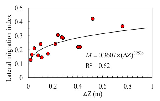 The base level is considered to be the key downstream boundary condition of an alluvial river, and the change in base level can lead to significant morphological adjustments [20]. Previous studies have shown that changes in TG elevation can greatly affect the aggradation and degradation processes in the Xiaobeiganliu reach [43,44]. To investigate the effect of downstream boundary conditions on lateral migration in the Xiaobeiganliu reach, the relationship was established between the channel lateral migration index and the variation in the annual TG elevation (Figure 8). It was found that the lateral migration index increased with an increase in , and the relationship could be written as , with a correlation coefficient of 0.62. This result implied that the downstream boundary conditions played an important role in the channel lateral migration, and the drastic change in the annual TG elevation could greatly increase the channel lateral migration in the Xiaobeiganliu reach.