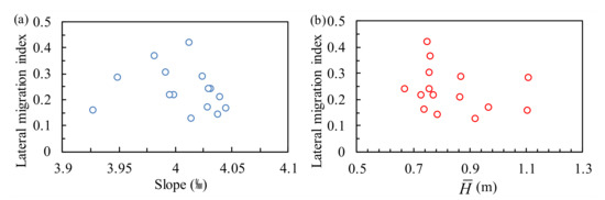 Previous studies have shown that channel lateral migration is also affected by other boundary conditions, such as channel slope, bank soil composition, riparian vegetation, variables of planform geometry, and river training works [29,31,35,45]. Figure 9a shows the relationship between the lateral migration index and channel slope in the Xiaobeiganliu reach during the study period, and the data were relatively scattered. The correlation analysis of two variables was conducted using SPSS, and the result showed that the p-value equaled 0.523 (>0.05), which indicated that there was no obvious relationship. Therefore, the channel slope had little effect on the lateral migration in the Xiaobeiganliu reach. Tian et al. [46] argued that the elevation difference between the floodplain and main channel may also influence lateral migration in wandering rivers, but the effect was not very significant. To investigate the effect of the elevation difference between the floodplain and main channel on lateral migration in the Xiaobeiganliu reach, Figure 9b shows the relationship between the lateral migration index and . The correlation analysis of two variables was also conducted using SPSS, and the result showed that the p-value equaled 0.335 (>0.05), which implied there was no obvious relationship between the two variables. Therefore, the elevation difference between the floodplain and main channel had little effect on the lateral migration in the Xiaobeiganliu reach.