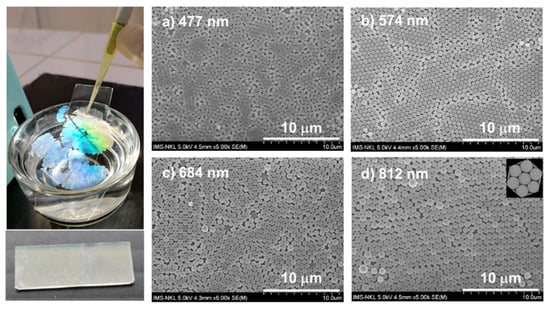 Trapping a monolayer of polystyrene (PS) sub-microspheres on the water/air interface (left panel), and SEM images of the close-packed monolayers of PS beads with diameters of (a) 477 nm, (b) 574 nm, (c) 684 nm, and (d) 812 nm after transferring them onto substrates.