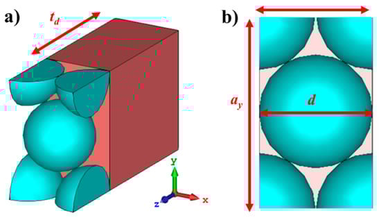 For simulations, we employed the finite-difference time-domain (FDTD) solver in CST Microwave Studio software to simulate the transmission spectra of the structures. A model consisting of a monolayer of hexagonal close-packed dielectric microspheres with dielectric constant on a dielectric substrate with dielectric constant was studied. As shown in Figure 2, the first layer of the unit cell is a sphere of diameter in contact with four quarters of a sphere at each corner, and the second layer is a dielectric substrate of thickness . A periodic boundary condition was applied. The period of unit cell structure is and in the and directions, correspondingly. In order to accelerate the computational time, the thickness td of the substrate was set to be td = 15,000 nm in the simulation, instead of the actual thickness of the glass substrates. A series of parameter pre-screening tests showed that thicker ( > 15,000 nm) has a negligible effect on the simulated transmission spectra. The dielectric constants of the spheres and substrate were chosen to be () and (), respectively. These dielectric constant values are close to those of polystyrene and glass in the visible range [30,31]. In the model, the PS microspheres and dielectric substrate were considered nonabsorbing, with the imaginary part of the dielectric constants equal to zero. The incident electromagnetic wave is perpendicular to the surface of the structure. The electric and magnetic components of the wave are along the y-axis and x-axis, correspondingly. Two transmitters and receivers are located on the sides of the structure along the z-axis to measure the transmission scattering parameters of the electromagnetic wave when it interacts with the PS/glass medium. Then, transmittance () would be obtained by .