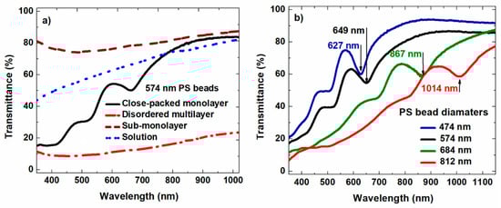 Figure 3a shows the transmission spectra of the 574 nm PS beads suspended in solution, as a sub-monolayer, and as a multilayer (dotted blue, dashed brown, and dash–dotted red lines, respectively), and that of a close-packed monolayer of the PS beads (solid black line). While the spectra presented as broken lines are rather smooth and do not have distinct features, the solid black line has apparent dips. Moreover, the positions of the first dips in the transmission spectra shift monotonically and linearly toward longer wavelengths as the size of the beads increases (Figure 3b). The ideal close-packed monolayer of the spheres is arrayed in a hexagonal lattice with lattice constant d. Theoretical works showed that for the case of a free-standing 2D hexagonal lattice of PS beads (), dips in the transmission spectra arise at the spectral positions where parameter satisfies condition Z = 0.71, 0.85, 1.00, 1.34, or 1.55 [27]. Our simulation for the case of a hexagonal lattice of PS beads () on a glass substrate () shows that the most pronounced dip (the first dip from the left) in the transmission spectra in Figure 3b corresponds to Z = 0.7.