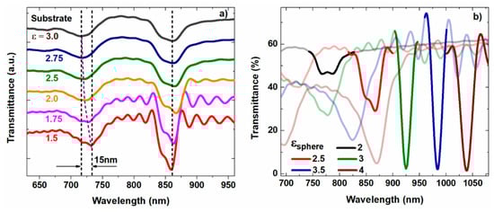 Simulated transmission spectra of a close-packed monolayer of 701 nm PS beads on a dielectric substrate (a) fixing while the dielectric constant of the substrate varies in the range of 1.5 to 3 and (b) keeping while the dielectric constant of the dielectric spheres changes from 2 to 4.
