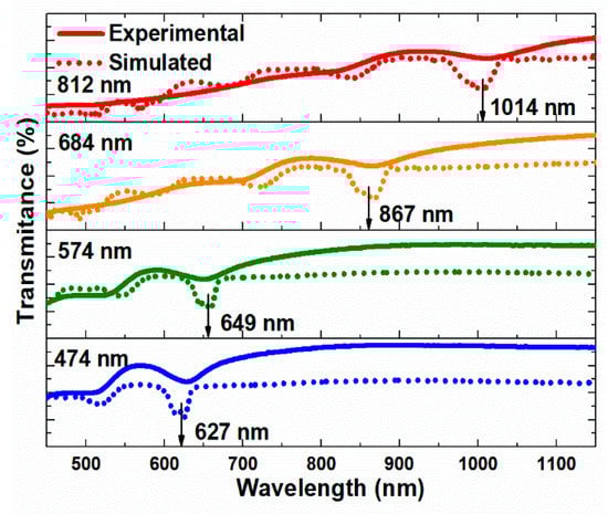 Transmittance spectra of a close-packed monolayer of PS beads; solid lines indicate experimental results and dotted lines indicate simulated results. The parameters for the simulations were () and (), diameters of the PS microspheres: 507, 525, 701, and 820 nm.