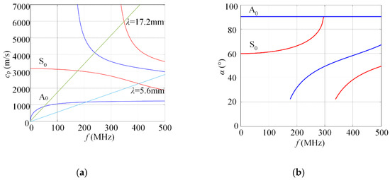 The fundamental A0 mode has been selected in this paper. As multiple guided wave modes are being generated simultaneously, different strategies exist to excite isolated modes, such as angle beam excitation [27], element width selection [28], inter-element spacing or interdigital transducers [29,30], in-phase and out-of-phase excitation [31], etc. In this research the fundamental dispersion zone has been selected and the excitation frequencies were limited from 50 kHz up to 200 kHz. At such frequencies, the wavelengths of A0 mode varies from 17.2 mm (at 50 kHz), to 5.6 mm (at 200 kHz) at 4 mm GFRP plate (Ex = 10 GPa, Ez = 35.7 GPa; υxz = 0.325, υzx = 0.091, υyx = 0.35; Gxz = 2.8 GPa; ρ = 1800 kg/m3). This shows that both A0, S0 and higher order A1 and S1 modes can exist at such a constant wavelength (see Figure 2a). However, using a Plexiglas wedge (2700 m/s) as a coupling medium and normal incidence angles, the fundamental A0 mode is being generated most effectively (see Figure 2b), and sophisticated mode isolation techniques were not applied.