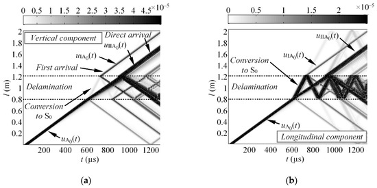 The scattering of the incident A0 mode at the delamination-type defect is further illustrated with B-scans in Figure 4 which were simulated by using the Finite Element plane-strain model on a 2000 mm × 4 mm 2D GFRP plate. These B-scans represent a centered delamination-type defect located at a depth of 1.5 mm with respect to the top surface of the sample. A0 mode was excited with a Gaussian envelope tone burst of three cycles and a central frequency of 80 kHz. The signals which are analyzed in this paper are denoted as uIIA0(t) (“direct A0 transmission”) and uIA0(t) (“first A0 arrival”) in Figure 4.