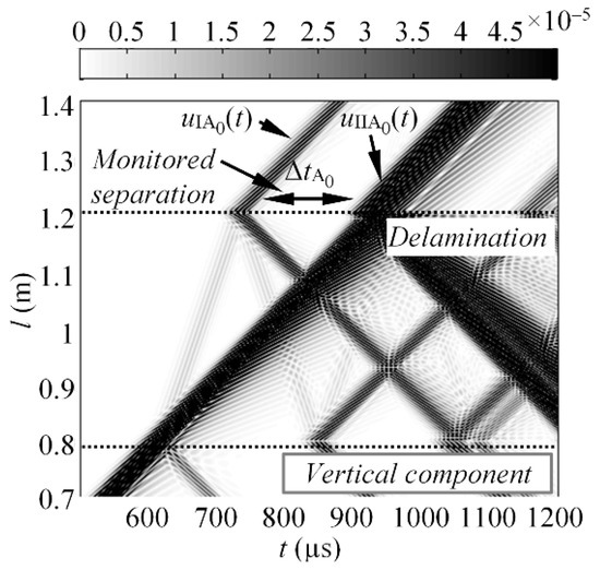 As the “direct A0 transmission” uIIA0(t) is the result of the interference between the wave packets propagating above and below the defect, the maximum of the wave after the exit of delamination (uIIA0(t)) may be shifted and no longer correspond to the wave energy velocity. Hence the delay ΔtA0 in Equation (6) will be estimated with some error. The best way here would be to calculate the delay according to the mean energy (mass center) of the signal [32]. However, in such case the time window covering entire signal should be selected. Such a task is not trivial due to the dispersion of A0 mode signals, presence of other modes and reflections from object boundaries. Additionally, the different frequency components of the dispersed A0 mode are redistributed in the envelope of the signal. The lower frequency components are concentrated at the tail of the signal. So, the energy of wave packet uIIA0(t) should be related to a particular frequency and velocity which are used for estimation of the time of flight. By using a maximum or Hilbert envelope of the signal it can be assumed that it corresponds to the dominant frequency of the signal and gives sufficient ToF accuracy.