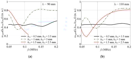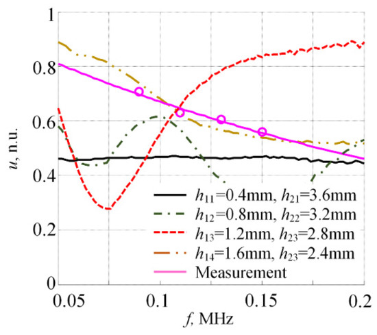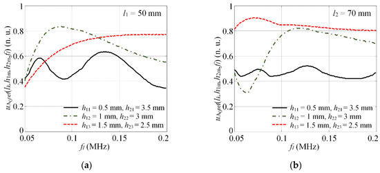 In order to estimate the depth of the defect, the procedure described in Section 2 is employed. The reference dependency is calculated according to Equations (9)–(11) for defect lengths l1 = 10 mm, l2 = 11 mm, …, lN = 100 mm and defect depths h11 = 0.5 mm, h12 = 1 mm and h13 = 1.5 mm for the same set of excitation frequencies (f1 = 50 kHz, f2 = 60 kHz, …, fn = 200 kHz). Then, hopt is calculated by using Equation (4) in order to estimate the depth of the damage. The graphic illustration of ustd(h,l) at different lengths and depths is presented in Figure 13. The criteria to estimate the actual depth of the defect are based on the selection of the minimum of ustd(h,l). The estimated hopt values for sample No. 1 and sample No. 2 at different depths of the defect are summarized in Table 1.