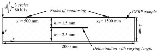 At first, the reference dependency estimation technique is verified numerically. A total number of 50 2D linear structural mechanics FE models were employed for an anisotropic GFRP plate with the dimensions of x = 2000 mm, y = 4 mm. In this case, the plain strain model was implemented by assuming that the object is infinite in the z direction. In each of the 50 models, delamination-type defects were introduced 1.5 mm below the surface (h1 = 1.5 mm, h2 = 2.5 mm) by separating the appropriate nodes of the mesh. The length of delamination l varied from 10 to 500 mm with an increment of 10 mm, thus yielding a total number of 50 numerical models. The delamination was centered horizontally along the x axis of the investigated sample for all the defect lengths. Throughout the simulations, 2D structural solid plane-42 finite elements were used. The spatial size of the element was equal to 0.5 mm, which corresponds to 26 nodes per wavelength if the slowest A0 mode at 80 kHz central frequency is considered. The excitation signal in all cases was a Gaussian envelope tone burst of three cycles and a central frequency of 80 kHz. Such an excitation regime was deliberately selected to converge with the experimental verification, which will be described further in this section. A0 mode was introduced by applying out-of-plane displacements to the first node column of the model located on the sample edge (see Figure 8). Such a force excites both fundamental A0 and S0 modes at a given frequency band and acts similarly to a simple thickness mode transducer. The integration step in the time domain was 0.625 µs, which is 1/20 of the period at 80 kHz central frequency. Throughout the simulation, a generalized stiffness matrix was used to describe a symmetric GFRP laminate (biaxial: 0° and 90°/bias: ±45°/biaxial: 0° and 90°)S, while employing the research conducted by Ryan et al. [33] Hence, the stiffness matrix was obtained by summing up the contribution of each ply in terms of their respective thicknesses. The following material properties of GFRP were used: Young’s modulus (Ex = 10 GPa, Ez = 35.7 GPa); Poisson’s ratio (υxz = 0.325, υzx = 0.091, υyx = 0.35); shear modulus Gxz = 2.8 GPa; density ρ = 1800 kg/m3. The sketch of the numerical model used in this study is presented in Figure 8.