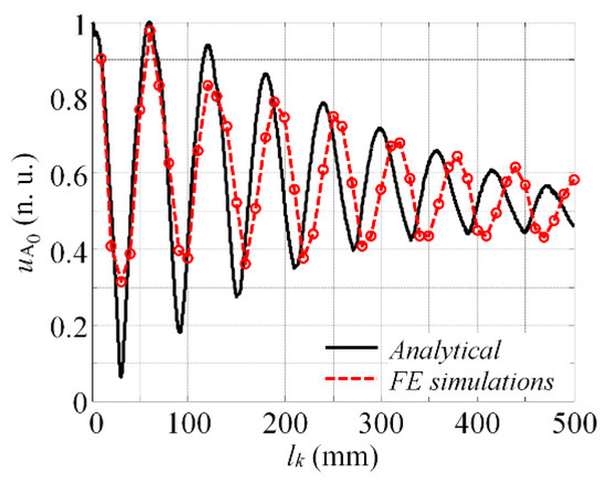 As mentioned previously, the proposed technique to estimate the depth of delamination relies on reference calculations, which means that the experimental signals must be compared to the model-based predictions. In order to extract the depth of the damage, the dependencies between the magnitude of “direct A0 transmission” UA0ref(f,h,l), excitation frequency (f) and depth (h) at fixed defect lengths (l) will be calculated. In this study, for the sake of simplicity, the estimation of reference dependencies shall be demonstrated on the 2D model of a GFRP plate.