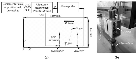 The experimental investigation was conducted by using custom-made low frequency ultrasonic transducers (130 kHz) operating in a thickness mode with an active diameter of 10 mm. The transducers possess the bandwidth of 100 kHz at −6 dB level and were driven by a 50 V tone-burst with a Gaussian envelope of 3 periods and a central frequency of 130 kHz. The number of cycles were selected to maintain a good balance between the amplitude measurements for depth estimation which requires narrowband excitation and ToF measurements for defect length assessment where a wideband excitation is preferred for better resolution. The best compromise between the propagation distance, the number of cycles, the wavelength and the resolution was selected according to the concept of the minimum resolvable distance (MRD), which was described by Wilcox et al. [34] In the experiment, the transducers were arranged in a pitch–catch configuration and attached perpendicularly to the surface of the sample to introduce A0 mode. The transmitter and the receiver were linked together and scanned along the short edge of the artificial defect as it is shown in Figure 10a. To achieve a reliable and uniform acoustic contact between the transducer and the specimen, custom-made spring type adjusters were used (Figure 10b). As a result of the experiment, a set of waveforms at different defect lengths were collected. The peak-to-peak amplitude of each time trace was compared to the reference time history captured at the same basis on the defect-free region.