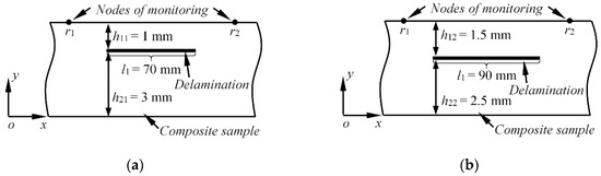 Graphic representation of investigated cases: sample No. 1 with 70 mm wide delamination located 1 mm below the surface (a), sample No. 2 with delamination of 90 mm at depth of 1.5 mm (b).