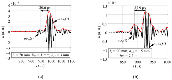 As the depth of the defect for both samples has been determined, the length is estimated by measuring the delay between the “first A0 arrival” uIA0(t) and “direct A0 transmission” uIIA0(t) of A0 mode. The delays are measured according to the maximum envelope values of each wave packet by using Equation (6). Then, the length of the defect is estimated according to Equation (7).