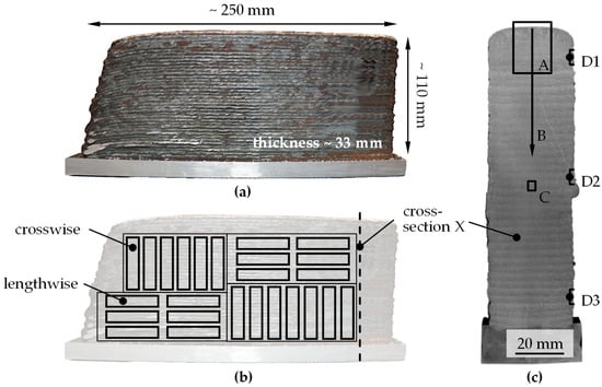Wire arc additive manufacturing (WAAM) material: (a) semi-finished block products, (b) sampling plan for tensile specimens with directional designation related to the weld layers, (c) regions for micrographs (A and C), path for hardness measurements (B), and points for residual stress determinations (D1 to D3).