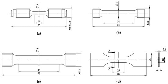 - Tensile specimens with a diameter in the test range of 8 mm for monotonic tensile tests at elevated temperatures according to [12], Figure 2c.In addition,