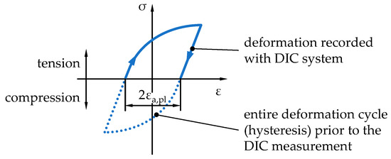 To determine whether the deformation under cyclic loading localizes in certain areas of the layer structure, the local deformation behavior was investigated by drawing on a digital image correlation (DIC) system. Therefore, strain-controlled experiments with flat specimens (see Figure 2d) were carried out. The surfaces of specimens were prepared with a very fine black speckle pattern using white varnish as a primer coat to achieve high contrast. In particular, good adhesion between the specimen and the varnish as well as a thin application thickness were required for accurate measurements.