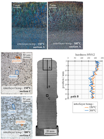 To gain a first impression of the influence of the interlayer temperature on the material properties, the microstructure was examined. The corresponding micrographs are shown in Figure 5. For both interlayer temperatures, it can be seen in region A that the appearance of the microstructure changes within the last three to five top layers between typical textures known from welds for the material group of steel and a rather fine grain structure. The finer grain size in the lower layers can be explained by the heat treatment through the sequel layers leading to a fine-grained microstructure due to the transition from ferrite to austenite and back in accordance to the formation mechanisms regarding heat-affected zones in joint welding. There, the temperature was kept at a higher level for a longer time than in the top layers for which sequel layers are missing.