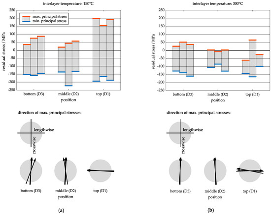 Residual stresses (principal stresses) and corresponding directions for the maximum principle stresses determined using the hole-drilling method for interlayer temperatures of 150 °C (a) and 300 °C (b).