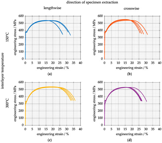 Stress–strain curves (engineering stresses and strains) from monotonic tensile tests at room temperature for interlayer temperature of 150 °C for lengthwise (a) and crosswise (b) extraction direction and for interlayer temperature of 300 °C for lengthwise (c) and crosswise (d) extraction direction.