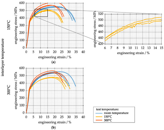 Stress–strain curves (engineering stresses and strains) from monotonic tensile tests for crosswise extraction direction and interlayer temperatures of 150 °C (a) and 300 °C (b).