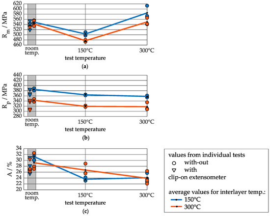 While a pronounced yield strength ReH is found at room temperature and 150 °C, at 300 °C the yield strength Rp0.2 is used instead (see italic values in Table 3). This need to be kept in mind for the comparison of the yield strength Rp—depending on the test temperature, the two different properties ReH and Rp0.2 are used. Figure 9 shows the dependencies between the determined average properties and the test temperature. To facilitate comparison, for room temperature, the properties determined from the stress–strain curves in Figure 7 have also been added to this diagram (triangle markers in Figure 9).
