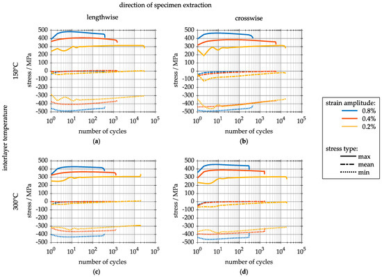 This section describes the results from the strain-controlled fatigue tests in the low cycle fatigue regime as well as the stress-controlled staircase tests to determine the fatigue limit. Figure 10 shows the cyclic hardening/softening curves for three exemplary strain levels (εa = 0.8%, 0.4%, and 0.2%) for each test series of strain-controlled tests. Moderate cyclic hardening is found independently from the strain level within the first load cycles applied. Afterwards, the stress amplitude shows an approximately stabilized behavior. For all specimens, a certain initial shift in the mean stress is observed. A mean compression stress of about −50 MPa is reduced towards zero as the number of cycles progress. The effect is slightly larger for the specimens that were extracted crosswise but seems to be independent from the interlayer temperature. This can be explained by the residual stresses mentioned above that remain within the microstructure to a small degree, despite the extraction of such small unnotched specimens.