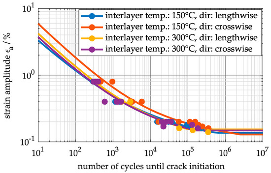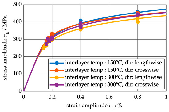 According to the definitions of the strain-life and cyclic stress–strain curves, Equations (1) and (2), the intercept points , , and K′ are located far from the center of the test results, Figure 3. and are defined at N = 0.5 and K′ at a plastic strain amplitude of εa,pl = 100%. Therefore, these values are of limited suitability for a comparison between the different data sets. Small errors in the regression have a significant influence on the characteristic values themselves so that dependencies are hard to find. Therefore, the results are compared using the plots of the corresponding curves in Figure 11 and Figure 12. It can be seen that the courses of the cyclic stress–strain curves are almost parallel to each other, and the curves are scattered over an area of approximately 50 MPa. Although the differences in the four curves are not very pronounced, the curves for the interlayer temperature of 300 °C are below the ones of the interlayer temperature of 150 °C. Apart from the curve of the interlayer temperature of 150 °C in the crosswise direction, all strain–life curves seem to fall in one scatter band. The first, however, shows numbers of cycles that are higher compared with the other curves by a factor of approximately 2.