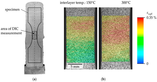 Therefore, strain-controlled experiments with flat specimens, Figure 2d, at a strain amplitude of εa = 0.4% were carried out. Figure 13a shows the used specimen in relation to the WAAM material. The layers are perpendicular to the loading direction. The recorded strain distributions are shown in Figure 13b for both interlayer temperatures.