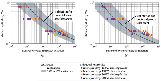 The study presented in [27] also contains a deviation range between the 10% and 90% quantiles for the estimation method. This scatter parameter describes the scattering of experimental values compared with the estimated curves and is also included in Figure 14. It can be seen that the fatigue life of the WAAM material is below the estimated strain–life curve for rolled and forged steel material in most experimental results, while it fits the estimated curve and rated scatter band for cast steel quite well.