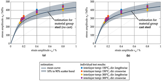 With both the estimated values for the strain–life curve as well as Equations (3) and (4), it is possible to estimate the properties for the cyclic stress–strain curves. These are plotted in the same way as the strain–life curve, Figure 15. Since the two estimated curves do not differ much between steel and cast steel, the deformation behavior for the WAAM material is in good agreement with both material groups.