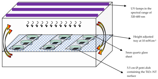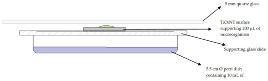 The loops were rehydrated in 50 mL of previously sterilized tryptic soya broth (TSB Oxoid™). A. brasiliensis and P. chrysogenum were rehydrated in a sterile Sabouraud-dextrose broth (SDB Oxoid™) supplemented with 0.05% of Tween 80. The addition of Tween 80 prevented the formation of cellular clumps and allowed the formation of single-celled cultures. C. albidus and A. brasiliensis were rehydrated in SDB without Tween 80. All the cultures were incubated with shaking at 37 °C at 120 rpm for 8 h under aerobic conditions. The microbial suspensions were individually adjusted with broth to 0.5 abs units at 600 nm which corresponded to 1.5 × 108 CFU. The resulting solution was used to test the antimicrobial activity of the coupons at full spectrum UV radiation. A total of 200 µL of microbial solution was uniformly placed on each coupon through the aid of a micropipette and placed into a climatic chamber (ICH 256 Memmert GmbH) set at 37 °C and 80% relative humidity. Figure 2 shows the typical experimental setup used. The coupons were placed onto a clean microscope slide and elevated on top of a 5 cm open petri dish [27]. To further prevent the microbial suspension from drying out the petri dish, over which the slide was placed, the petri dish filled with 10 mL of water. After 1 h of irradiation, the microbial solution was transferred into a sterile 5 cm petri dish and 1 mL of sterile 1× PBS was added. The contents of the petri dish was mixed gently to ensure that all the bacteria were recovered from the surface of the coupons. The PBS solution was transferred into a sterile microcentrifuge tube and aliquots were taken to prepare a serial dilution ranging from 10−2–10−6. From which 50 µL were taken and plated onto previously prepared plates of total count agar for bacteria and Sabouraud-dextrose agar (SDA Oxoid™ Basingstoke, United Kingdom) for yeast and fungi. The plates were incubated upside down for 10–20 h at 35 °C. The resultant colonies were counted, and the percentage antimicrobial activity of the surface was expressed relative to untreated titanium blank coupons. The experiment was repeated using the same conditions without UV light to ensure that the observed antimicrobial activity could be attributed to the effect of UV light and coupons.
