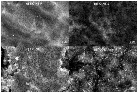 Surface view of the nanotubular morphology of the different photocatalysts: (A) TiO2NT-P, (B) TiO2NT-S, (C) TiO2NT and (D) TiO2NT-Ag.