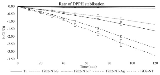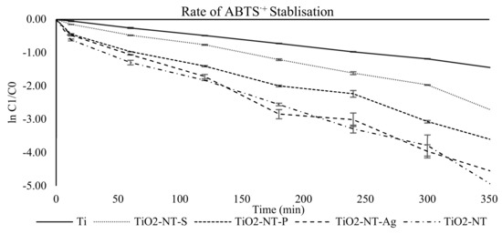 The DPPH assay was used as a measure of the catalytic activity of the surfaces. The reaction behind the decolourisation of the DPPH radicals seems to follow a pseudo first-order rate of reaction. This can be seen from Figure 4, where the plots of the logarithm of the absorbance at 532 nm against reaction time give straight lines for the different materials. The reaction rate constants, k, were determined from the gradient of each line. Figure 4 reveals that TiO2-NT and TiO2NT-Ag silver had a significantly higher rate of DPPH stabilisation when compared to the nanotubes formed in aqueous media.
