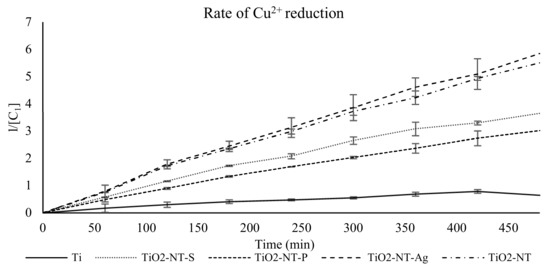 The potential reducing activity of the surfaces against Cu2+ ions was found to follow a second-order rate of reaction. This can be demonstrated in Figure 5, where the plots of the reciprocal absorbance at 450 nm against reaction time give straight lines for the different materials. The reaction rate constants k was determined from the gradient of each line. From Figure 4, it was shown that the TiO2-NT and the surfaces containing silver had a significantly higher rate of Cu2+ reduction when compared to TiO2NT-S and TiO2NT-P.