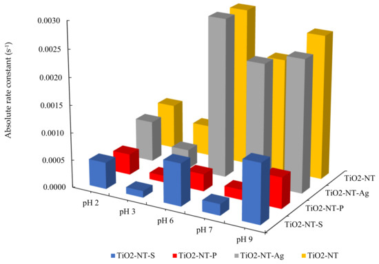 Figure 7 shows the rate constants obtained for the different TiO2NT surfaces under different pHs. The results indicate that, in general, as the pH values decrease, the rate of tannic acid decomposition decreases; however, this does not vary in a linear fashion. To understand the influence of pH on photocatalytic degradation, several factors need to be taken into consideration, including the charge of the surface and the tannic acid at each pH and also the concentration of radical precursors in solution. The surface charge is greatly affected by the pH of the solution. An isoelectric point at approximately pH 6 is widely reported for titanium dioxide surfaces in contact with aqueous solution [38,39,40]. Thus, it is expected that, below the isoelectric point, the TiO2 surfaces would be positively charged, while, above the isoelectric point, the TiO2 surfaces would be negatively charged due to the following ionization reactions.