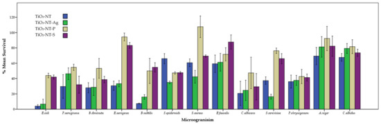 The potential application of TiO2 nanotube layers as antimicrobial surfaces was determined against a panel of microorganisms composed of three Gram-positive and three Gram-negative bacteria, together with two yeast and three fungal organisms. The individual percentage mean survivability of the microorganisms tested on different surfaces is shown in Figure 8. The selection of microorganisms was based on cell wall variation and the experiment was designed to determine whether the cellular outer protective layer affects the susceptibility of microorganisms to the photocatalyst surfaces. Figure 9 shows the % survival rate of the microorganisms grouped combined into four groups, according to their characteristics using different materials.