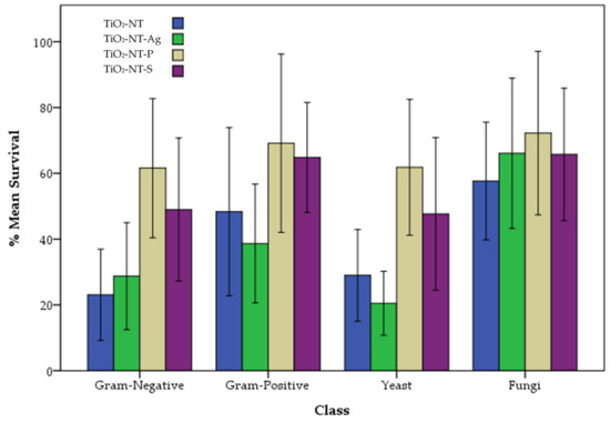 To determine the difference in the susceptibility of a microorganism to TiO2-NT surfaces, these were grouped into four groups depending on the characteristic of the cell walls of different microorganisms, as shown in Figure 9, corresponding to Gram-negative bacteria, Gram-positive bacteria, yeast, and fungi. Statistical analysis showed that there was a significant difference in % survivability between Gram-positive and Gram-negative bacteria (p-value 0.015) and between fungi and yeast (p-value < 0.001). On the other hand, no significant difference was observed in the susceptibility between yeast and Gram-negative bacteria (p-value 0.998). These observations suggest that, apart from the effect of the photocatalyst, the observed susceptibility is also dependent on the group of microorganisms under investigation.