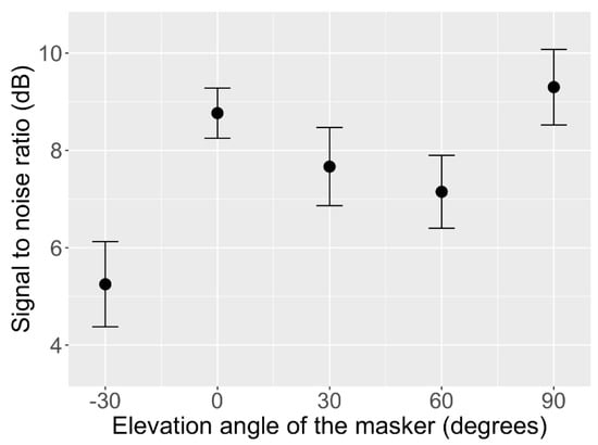 Signal-to-noise ratio (SNR) for 50% correct speech reception as a function of the elevation angle of the masker. The plots represent the mean average of SNRs obtained from six subjects and one standard error.