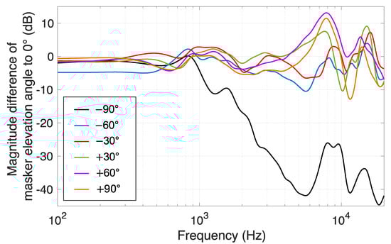Head-related transfer function (HRTF) difference of each masker position to 0° elevation (reference) using average HRTFs of eighteen human subjects (SADIE II database [16]).