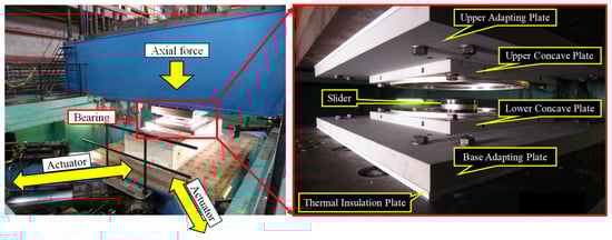 - Takanori, I.; Masashi, N.; Shoichi, K.; Satoshi, Y.; Koji, N.; Atsushi, W. Experimental and Analytical Study on Spherical Sliding Bearing Subjected to Bidirectional Excitation (Part 1 Bidirectional loading tests and verification of mechanical model), Paper No. 21491. In Proceedings of the Summaries of Technical Papers of Annual Meeting, Tohoku, Japan, 4–6 September 2018; Volume 24, pp. 981–982. [Google Scholar]