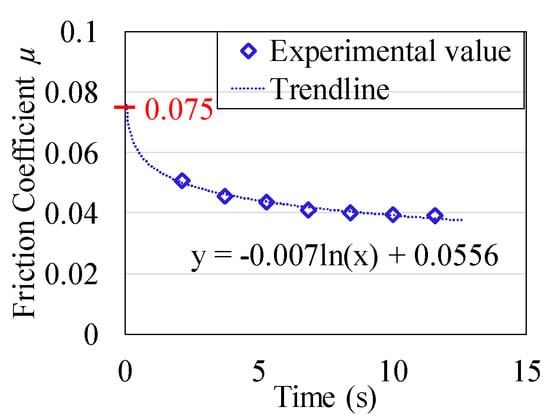 where µ, γ, α and β are the friction coefficient, pressure dependency factor, velocity dependency factor and temperature dependency factor at each time, respectively, and µo is the friction coefficient at 60 N/mm2 (γ = 1), 400 mm/s (α = 1) and an atmosphere temperature of around 20 °C (β = 1), which was selected as 0.075 for all the specimens in this study. µo was calculated from the trend line of the friction coefficient versus the time from the dependency test T01 in Table 1, which was when the time was approaching zero, as shown in Figure 4. The experimental values in this figure represent the friction coefficients near zero displacement where the velocity was 400 mm/s and the pressure was 60 N/mm2.
