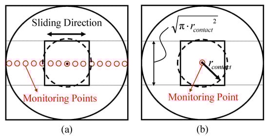 Two friction models are proposed as precise and simplified models, and both considered the pressure, velocity and temperature dependency introduced in Section 4.1. Meanwhile, the precise model applies the precise temperature simulation model shown in Figure 5a and the simplified model applies the simplified temperature simulation model shown in Figure 5b, where rcontact is the radius of the bearing and the monitor points are virtual points in the model used for temperature simulation, which is proposed by Constantinou, M.C. et al. [4,17]. As the precise model has a lot of monitoring points along the sliding direction, the simulation results are more precise. However, for the simplified model, which only applies one monitoring point, the calculation speed is much faster. Therefore, the validation of the simplified model is very important in judging whether it can be used instead of the precise model.