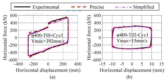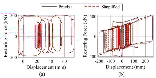 The comparison of the first hysteresis curve between the friction models and the experimental results of the DCFP bearings with 400 mm-diameter sliders under both strong and weak excitations are shown in Figure 6, and show high accuracy for both friction models. The input excitations in Figure 6a,b are the first cycles in T01 and T02 of the ASCE test, respectively. Meanwhile, as an error criterion, the values of the post-yield stiffness, effective stiffness, effective damping and energy dissipated per cycle were also calculated to quantify the validity of the models [6]. In all of the ASCE tests, the simplified model shows a similar accuracy to the precise model, with both models showing high accuracy in the simulation of the behaviours of the DCFP bearings [19].