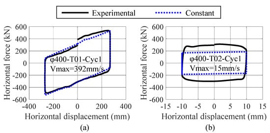 The accuracy of using µn under strong excitation and weak excitation is shown in Figure 8. The results showed that µn was suitable for strong excitations but could not be used under weak excitations. In the other tests in Table 2, which can all be considered to be strong excitations, the simulations using µn all showed that the force–deflection relations of the DCFP bearings had no large differences [19]. Therefore, the constant friction coefficient, µn, could be applied for the rough behavior estimation of DCFP bearings under seismic loads. For example, it could be applied for the response force simulation when the response displacement of the bearing is known.