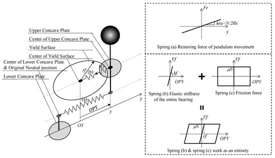 In Figure 9, the center of the lower concave plate is taken as the original neutral position. The stiffness of the upper structure is considered to be infinite in order to make the behavior of the DCFP bearing clearer. Whether sliding between the slider and the concave plate will occur or not is considered by a yield surface with a radius rf [21,22]. OY is the center of the yield surface, y is the displacement of the upper structure relative to the center of the lower concave plate and OPY is the distance from OY to y. The internal forces of the DCFP bearing are considered in terms of three springs: spring (a), spring (b) and spring (c). Spring (a) represents the restoring force of the pendulum movement. kra is the stiffness, N is the vertical force that acts on the DCFP bearing, and Rs is the spherical radius of the upper and lower concave plates. In this study, the DCFP bearings with slider diameters equal to 400 mm and Rs values equal to 4500 mm are set, and a vertical load that can provide 60 MPa of pressure on the slider surface is applied. Therefore, kra equals 0.838 kN/mm. Spring (b) represents the elastic stiffness of the entire DCFP bearing with a value of kf = 1900 kN/mm, based on experimental results. Spring (c) represents the friction force between the slider and two concave plates. Spring (b) and spring (c) work entirely to simulate the friction force. The friction force is represented by spring (b) when there is no sliding and by the friction models, introduced in Section 2, during sliding.
