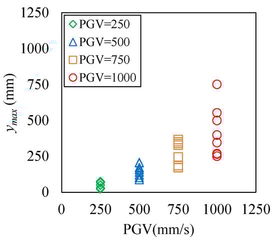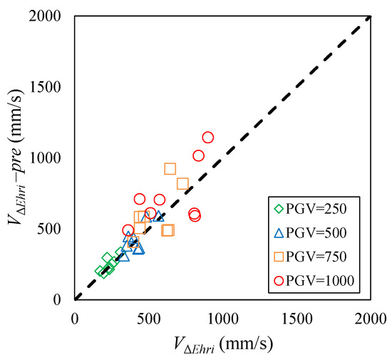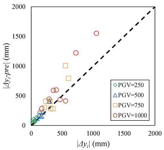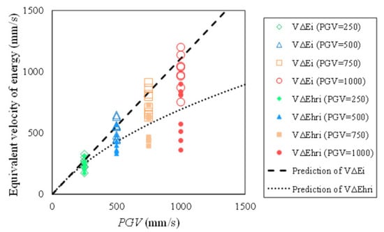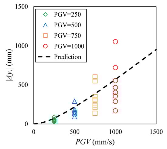 In Figure 26 and Figure 27, the data points show the analysis results for the maximum VΔEi, VΔEhri and Δyi under various earthquake inputs with their PGVs amplified to 250, 500, 750 and 1000 mm/s; the dashed line shows the prediction result under earthquake groups with different PGVs. The prediction results are a little above the average because of the selected value of the generalization parameter ζ and ε.