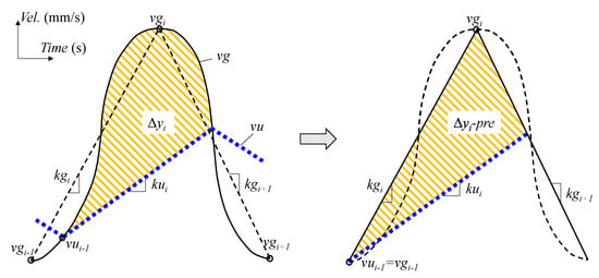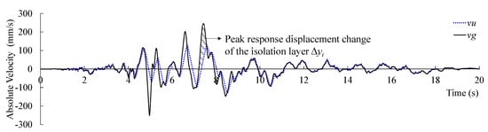 As shown in the left figure of Figure 16, the solid line shows a ground velocity pulse from vgi−1 to vgi to vgi+1 and the two dashed lines show the slope from vgi−1 to vgi and the slope from vgi to vgi+1, respectively, which can be understood as the average ground acceleration. The dotted line is the absolute velocity of the upper structure, and its slope can be roughly considered to be constant, as introduced in Figure 14. Furthermore, since the points where vu and vg intersect are determined by the former velocity history, the intersection in the left figure of Figure 16 was randomly picked between vgi−1 and vgi, referred to as vui−1. At the intersection points, vu was equal to vg, which meant that v was equal to zero, and this meant that the direction of the response displacement of the isolation layer, y, would change from the next second. Then, until the next intersection, y would be in the same direction; reach the peak displacement change, Δyi; and reverse direction again. Then, how the calculation of Δyi can be simplified under a large velocity pulse is shown in the right figure of Figure 16. In the simplification, vui−1 and vgi−1 are assumed to be equal, which is a conservative assumption for predicting Δyi: