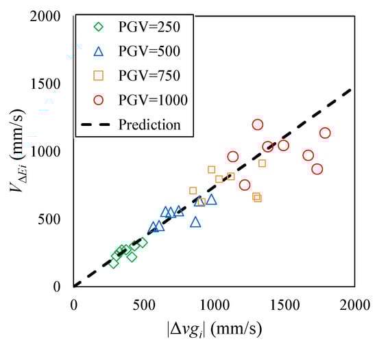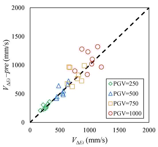 Equation (22) gives the prediction equation of VΔEi-pre. It shows a linear relationship between VΔEi-pre and the absolute value of the peak ground velocity difference, |Δvgi|, which equals to |vgi- vgi-1|. By observing the relationship between the analysis results for VΔEi and |Δvgi|, as shown in Figure 20, it was found that the value of kgi could be taken as a constant without causing large differences.