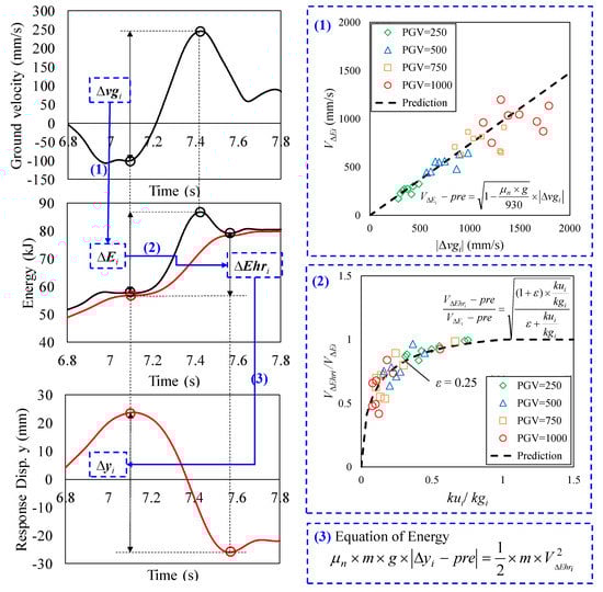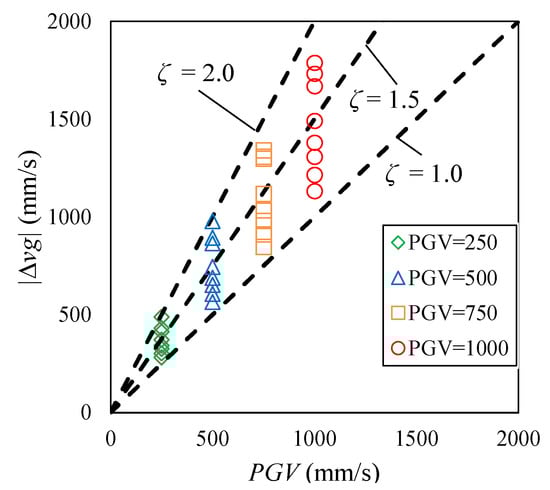 In order to give a general prediction of the maximum response displacement change and input energy of an isolation layer under a group of earthquakes with a certain intensity, the specific earthquake characteristics, such as Δvgi and kgi, should be replaced. Therefore, Equation (29) is proposed, where ζ is the generalization parameter of the ground velocity. As shown in Figure 25, based on the earthquake records, |Δvgi| was assumed to be 1.5 times the peak ground velocity (PGV) in this study.