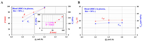 Q0 = 1, 1.5, and 2 mL/h. Here, the hematocrit was fixed at Hct = 50%. As shown in
